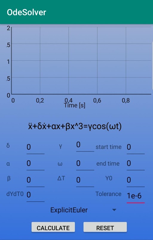 Questa app è un solutore di EDO (Equazioni Differenziali Ordinarie) attraverso un approcio numerico. L' equazione differenziale ordinaria è un oscillatore con un termine non lineare cubico (equazione di Duffing). Viene data la possibilità di imporre le condizioni iniziali, la durata delle simulazioni e di integrare l' equazione con diversi schemi numerici.