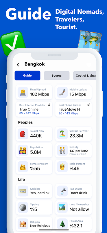 La nostra app offre consigli personalizzati su misura per il tuo viaggio e il tuo stile nomade, con oltre 1.500 città e paesi da scoprire. Le nostre guide, punteggi e altre informazioni accurate ti aiuteranno a pianificare il tuo prossimo viaggio. Cerca i nostri elenchi personalizzati di città selezionate a mano, che vengono regolarmente aggiornati con i migliori posti dove andare e soggiornare. Cerca rapidamente le città e apprendi tutte le informazioni necessarie prima o durante i tuoi viaggi.