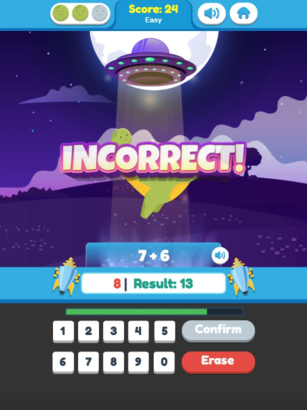 Try to answer correctly to save the dinosaur. If you lose, the dinosaur will be captured by the aliens.