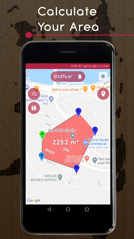 Distance Calculator and Measurement of Land helps you to calculate your land and area by putting location marks on a map.You can also calculate by drawing line by your hand and see the exact distance between two points or multiple points.you need to search Calculator Measurement of Land on google play and find our application and install our app.If you want to calculate distance just click on button and after that it will take you too map where you can find your location and you can easily draw mark and line to find total area between your marked points.it will helps you to calculate your house,land and other places total area also mileage calculator.