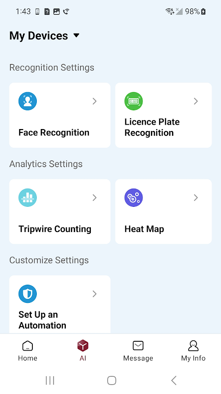 Configurare l'IA non è mai stato così facile grazie alla nostra dashboard dedicata al modulo IA. Da un'unica posizione, è possibile configurare le impostazioni di riconoscimento, abilitare analisi intelligenti avanzate e creare scorciatoie di automazione personalizzate in base alle proprie esigenze, ottenendo il controllo completo su come il sistema di sicurezza rileva, risponde e si adatta.