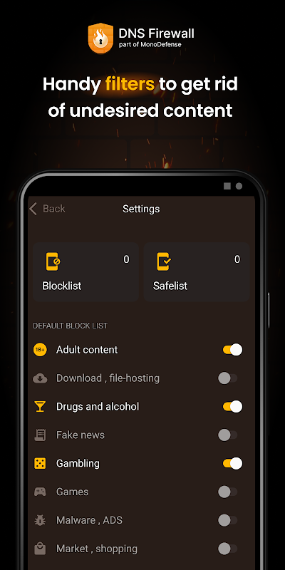 Come sai, prevenire è meglio che curare. Filtrando il traffico in tempo reale, DNS Firewall blocca i siti Web dannosi e i domini sospetti prima che possano causare danni. Inoltre, l'app protegge il tuo dispositivo Android da attacchi di phishing, siti Web che ti inondano di annunci pop-up e contenuti indesiderati come giochi, giochi d'azzardo, notizie false, contenuti per adulti, ecc.