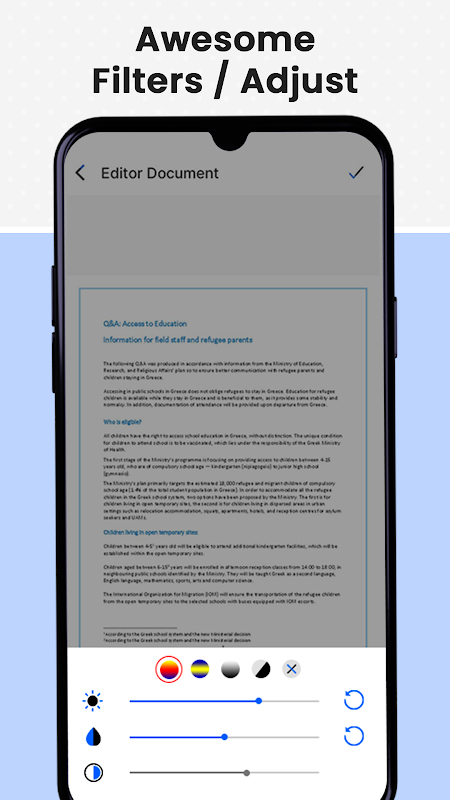 We designed the PDF scanner app to be intuitive and very easy to use, so the camera does all the hard work for you. When you scan a document, Document Scanner makes hundreds of decisions to capture the document perfectly, crop it, straighten it and apply a filter you choose to your document.