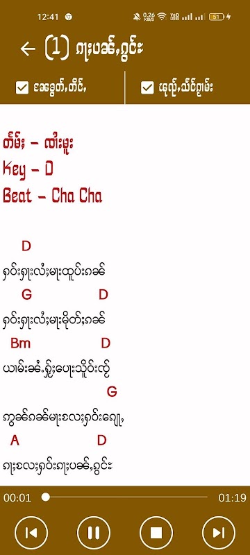 Inoltre, l'app supporta anche la funzione Modalità lettura, il che significa che puoi disattivare la canzone per vedere il testo della canzone più chiaramente. Basta semplicemente disabilitare il menu ၽုၺ်ႇသႅင်ၵႂၢမ်း (Enalbe Song) dalle voci del menu in alto a destra. Crediamo che sarà di grande aiuto anche per coloro che desiderano leggere solo i testi senza ulteriori disturbi, soprattutto per i cantanti che canteranno le canzoni di Dok Su. Inoltre, abbiamo aggiunto un'importante funzione per i chitarristi. Si chiama ၼႄၶွတ်ႇတိင်ႇ (Mostra l'accordo di Giluitar). Come suggerito, abilitalo mostrerà gli accordi di chitarra sia in LyricView che in MediaView. Questo per assistere i chitarristi che lo suoneranno.