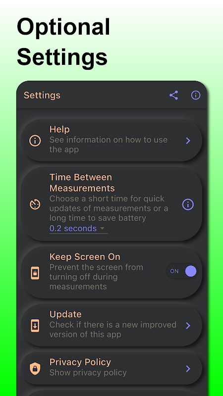 L'app utilizza le funzionalità avanzate del sensore della fotocamera del tuo smartphone, combinate con sofisticati algoritmi, per analizzare nel modo più accurato possibile la luce in arrivo e determinarne la lunghezza d'onda dominante. Questa tecnologia apre un mondo di possibilità, permettendoti di approfondire i dettagli intricati dello spettro luminoso nel nostro ambiente.