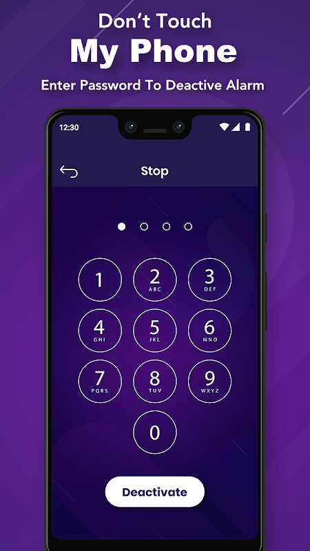 Questa applicazione Non toccare protegge il tuo telefono cellulare da furti e persone sconosciute, che cercheranno di aprire il tuo cellulare segretamente senza la tua autorizzazione. Con questa app di allarme antifurto, non avrai paura di lasciare il tuo cellulare ovunque nei tuoi dintorni. Questo allarme tiene al sicuro il tuo dispositivo da persone sconosciute e furti. Se attivi l'allarme, nessuno potrà toccarlo, perché il suono verrà attivato se qualcuno toccherà o prenderà il cellulare.