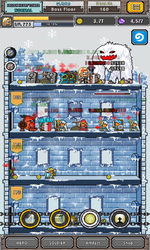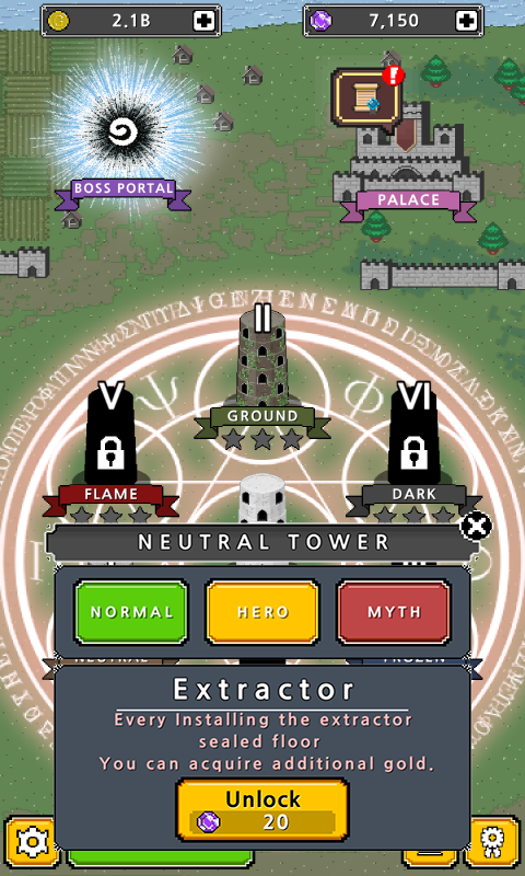 : Normal, Hero, and Legend modes are available. A powerful boss monster waits at the top of each tower.
