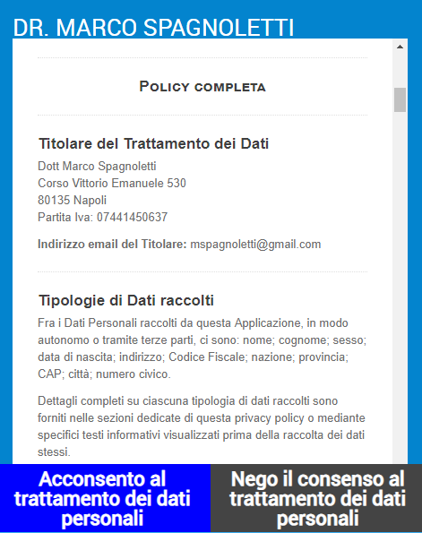 L'app permette di visualizzare l'informativa della privacy dello studio del dott. Marco Spagnoletti e di memorizzarne la scelta.