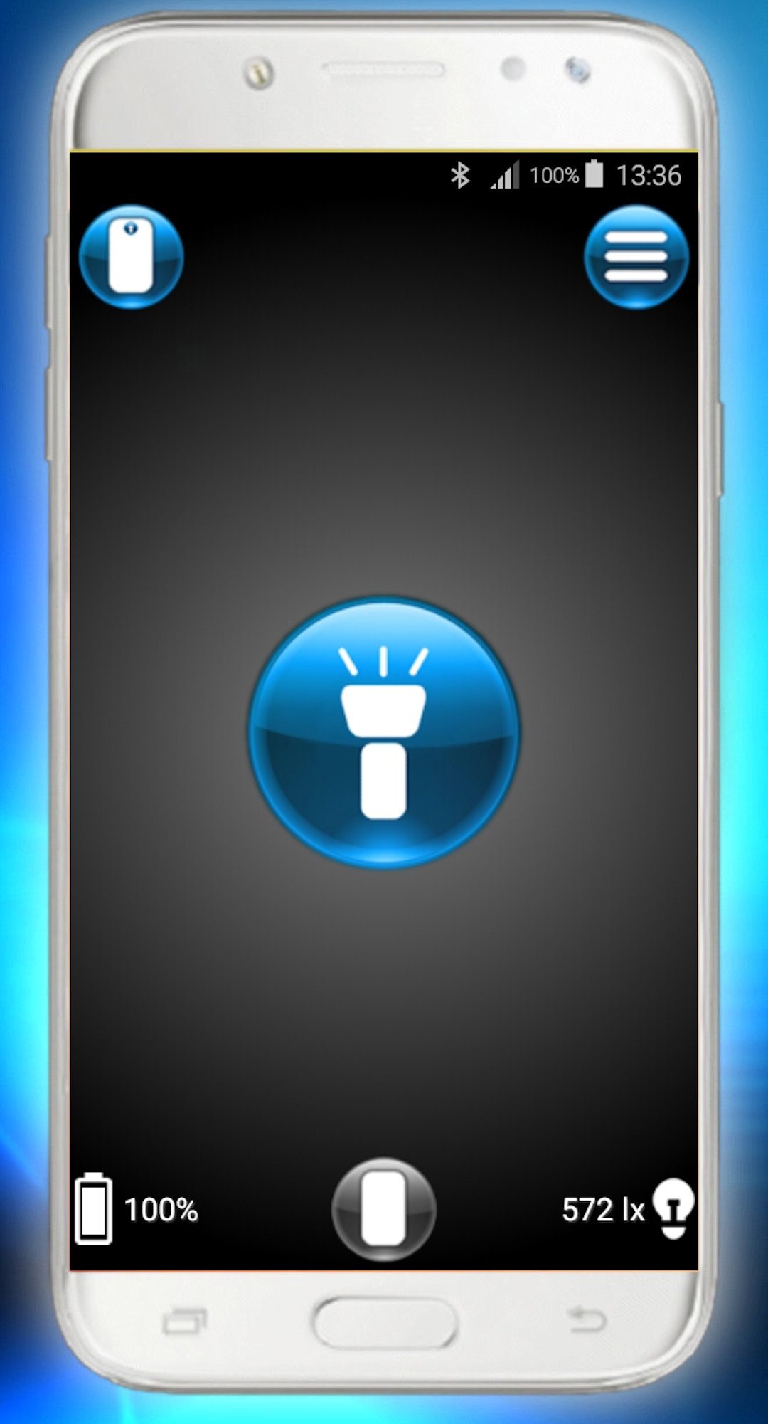 Controlla il flash della fotocamera come una torcia, così come la luminosità dello schermo come luce ambientale, consentendo così l'illuminazione anteriore e posteriore. Ha anche un misuratore di luce ambientale e mostra il livello della batteria.