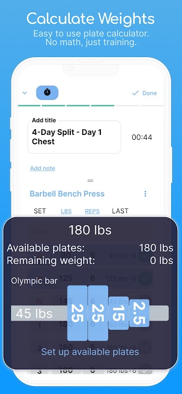 Con Double U Workout Tracker e Gym Log, puoi organizzare i tuoi allenamenti in routine e monitorare facilmente i tuoi progressi. Risparmia tempo registrando i set con la nostra funzione di registrazione integrata e concentrati sui tuoi allenamenti. Niente più calcoli complicati per i pesi: il calcolatore di piastre della nostra app se ne occupa per te, così puoi concentrarti sulla tua routine e risparmiare tempo nel calcolare i pesi.