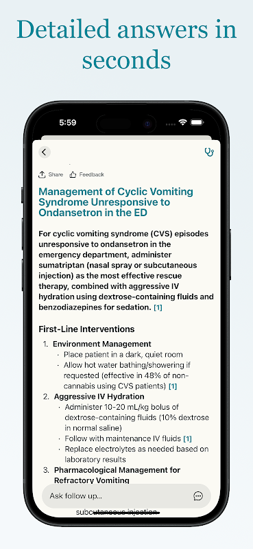 Avere una conversazione in tempo reale con tutte le linee guida mediche di tutte le sottospecialità mediche. La nostra intelligenza artificiale legge e comprende anche la letteratura medica direttamente da PubMed e utilizza prove reali quando risponde alle tue domande. Forniamo citazioni nel testo per le nostre risposte in modo che tu possa verificare e citare le nostre fonti. La nostra intelligenza artificiale esegue un fact-check per garantire che tutto ciò che dice sia accurato al 100% secondo la letteratura pubblicata.