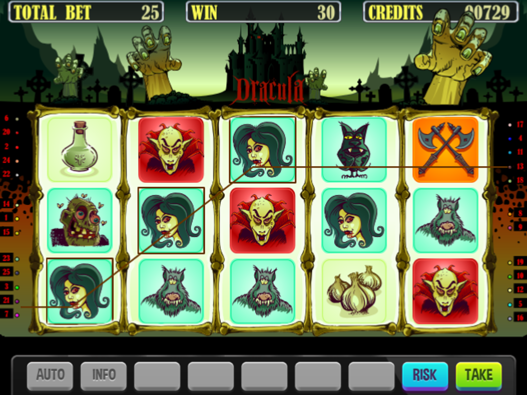 This Dracula slot machine will give you the power to suck out as many winnings as you please. Dracula is a 25 lines payout, 5 reels, with 2 bonus games, the possibility of doubling or quadrupling. You can bet from 1 to 25 coins for 1 played line and you can play from 1 to 25 lines.
