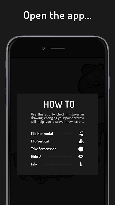 Solo una semplice app per individuare gli errori nei tuoi disegni. Punta la fotocamera verso il tuo disegno e usala come uno specchio dal vivo: puoi capovolgere la vista orizzontalmente e verticalmente (sottosopra) e individuare errori di proporzione o simmetria.
