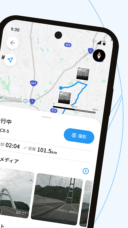 Il percorso di guida, la distanza, il tempo impiegato, ecc. vengono registrati automaticamente. Inoltre, puoi registrare splendidi paesaggi e scene emozionanti all'interno dell'auto come foto e video e importarli nel tuo registro di guida.