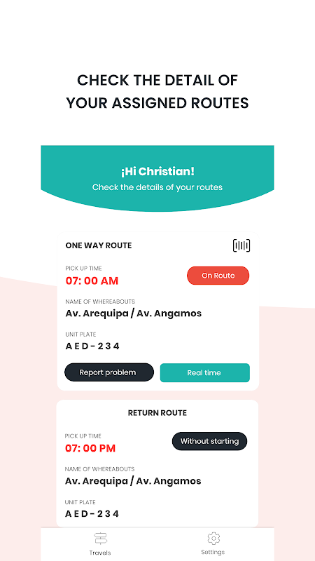 Potrai rivedere i tuoi percorsi, modificarli, tracciare la posizione del tuo autista in tempo reale, comunicare con lui, scansionare il codice a barre per registrare il tuo imbarco e segnalare qualsiasi problema al nostro team di supporto che sarà lì per aiutarti in qualsiasi momento tempo 🔛