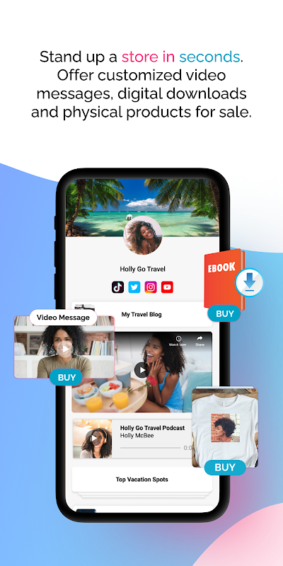 Crea un bellissimo negozio sul tuo link in bio con link di prodotti digitali e fisici da cui i tuoi utenti possono acquistare. Smetti di perdere clienti a causa di più clic e reindirizzamenti del sito web. Puoi vendere, ebook, merchandising, videomessaggi e molto altro direttamente nella tua biografia.