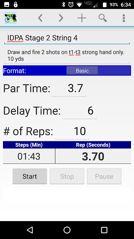 5. Formato base (semplice). Inserisci un tempo parziale, un ritardo e il numero di ripetizioni. Dry Fire Par Timer ripete l'esercizio.
