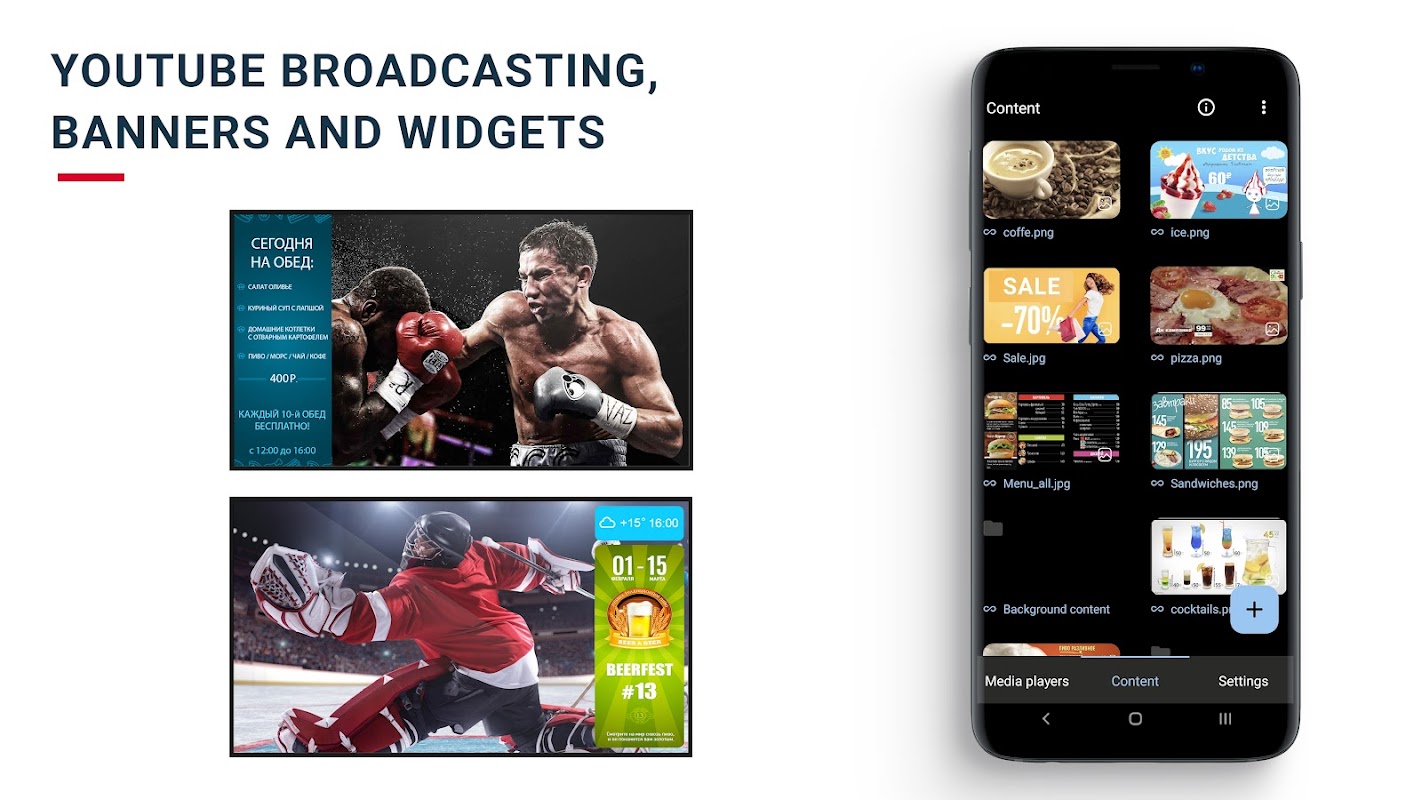 Utilizza DS-GO: Digital Signage Mobile per creare e programmare contenuti; il TV Player li mostra sui tuoi schermi.