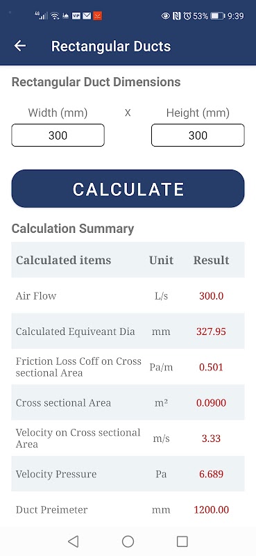in questa versione l'app calcola le dimensioni dei condotti rettangolari, dei condotti ovali piatti e dei condotti circolari.