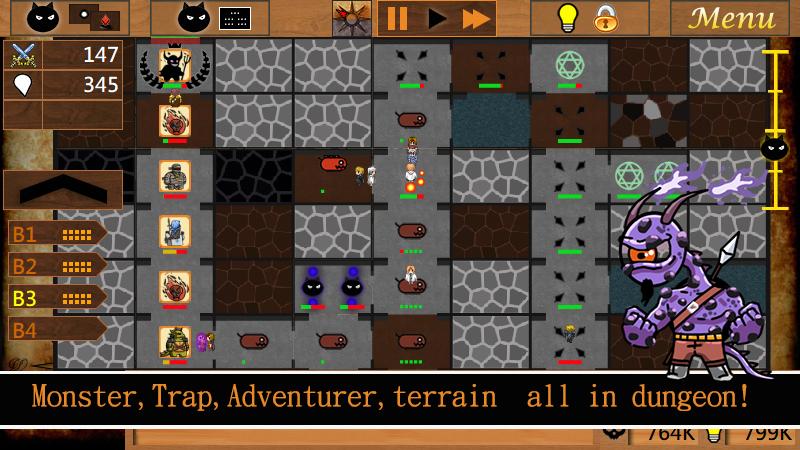 Adventurers have different occupations,they will be stronger with the evaluation of Dungeon. Adventurers also have different abilities, such as thieves can destroy the traps.Adventurers will also carry a item, you will get the item if they die. Besides,these items have different functions,remember to place it in the room.