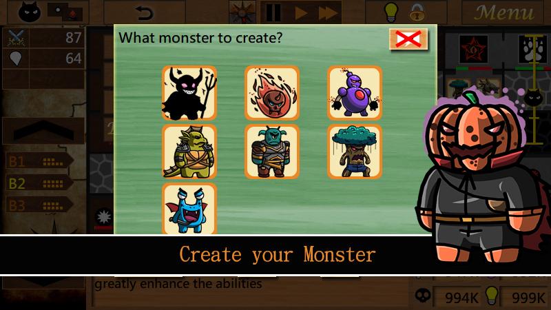 You can create different monster which has different talent, these monsters will be the most powerful regiment to defeat the adventurers.The monsters can be synthesized,they will become a more powerful monster.