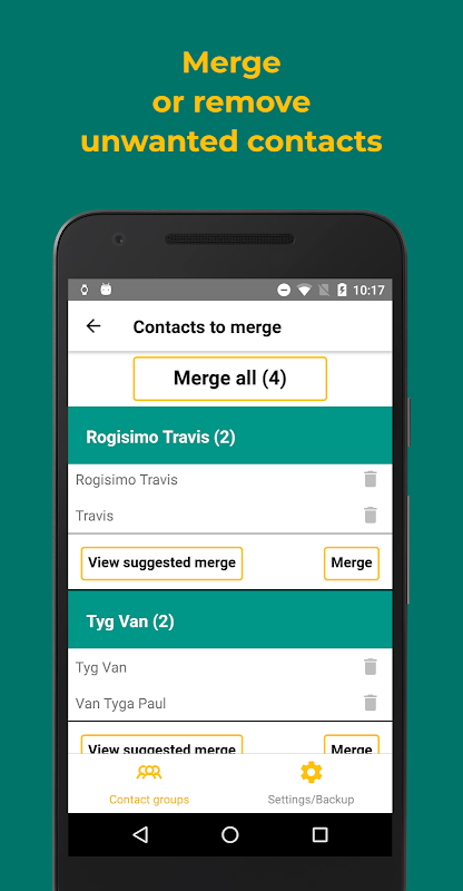 Easily find duplicate contacts and merge them with one tap. Instead of merging the duplicate contacts, you can clean up by deleting the contacts you don't need.