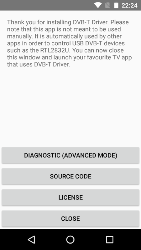 Attualmente solo l'app "Antenna TV" supporta questo driver. Assicurarsi di scaricare e installare Antenna TV per ricevere DVB-T / T2 con questo driver.