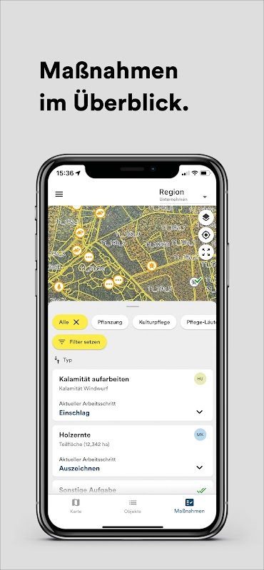 Dynamic Forest collega la pianificazione dell'azione con gli oggetti e le persone della mappa. Ad esempio, le misure per le colture o le scorte di manutenzione possono essere pianificate e assegnate alle aree e quindi assegnate a una persona responsabile. Ciò significa che è sempre possibile risalire a chi ha fatto cosa, dove e quando, e chi deve ancora fare cosa.