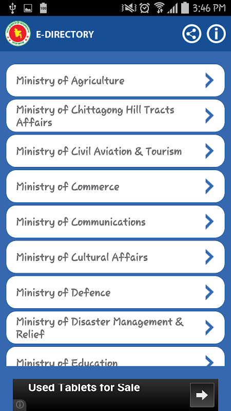 Utilizzando questa applicazione utente sarà in grado di contattare con i dipendenti designati di tutti i ministeri e le loro direzioni, dipartimenti e commissioni. Esso fornisce informazioni di contatto di tutti Govt. teste di ufficio e personale correlate di tutte le divisioni e distretti insieme con importanti contatti di alcuni istituti di rendering di servizio sociale.