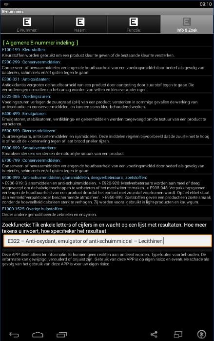 Het laatste tabblad bevat algemene informatie over E-nummers en een zoekfunctie met een automatische aanvulling op hetgeen u intoetst.