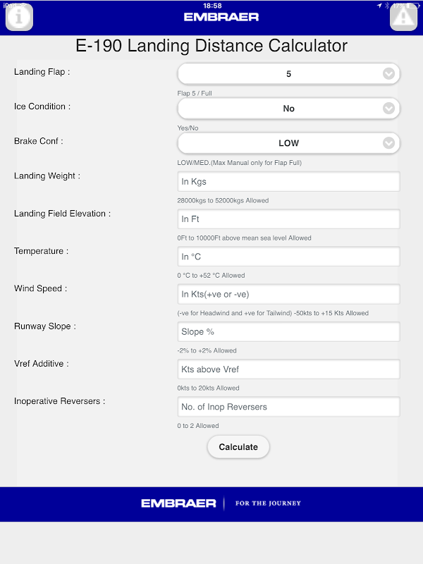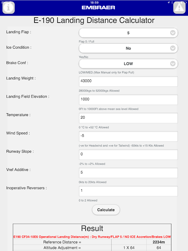 E190 Landing distance calculator is the perfect tool for every E190 pilot flying the 190 series. This app will calculate for you the required operational landing distance in just a few steps.