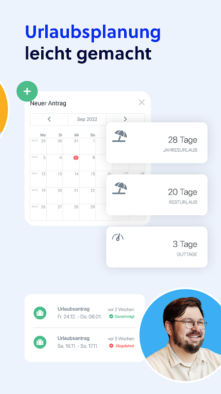 • Le ferie annuali, il riporto dall'anno precedente, le ferie usufruite e le ferie residue sono chiaramente visualizzate. E soprattutto: puoi inviare la tua richiesta di ferie con un solo clic. Per inciso, puoi anche tenere d'occhio i tuoi giorni di malattia in qualsiasi momento.