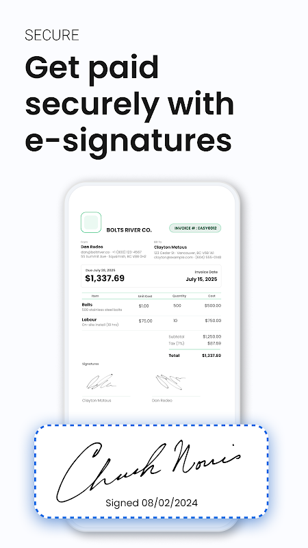 Scelto da migliaia di aziende e privati, Easy Invoice ti consente di gestire la tua attività con sicurezza e semplicità. Con Easy Invoice avrai un aspetto professionale, stupirai i clienti e verrai pagato più velocemente, tutto dal tuo telefono.