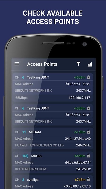 Easy Network è dotato di uno strumento di rilevamento dei dispositivi Wi-Fi ad alte prestazioni che include tutti i nomi di dispositivi, indirizzi e produttori della rete locale. La caratteristica principale dell'app è il test di velocità che calcola la velocità della tua connessione. Inoltre, EasyNet contiene strumenti di rete standard, come PING, W-O-LAN, PORT e WHOIS. Viene fornito anche con lo scanner del dispositivo che è stato sviluppato per la vostra convenienza. Infine, l'applicazione Easy Network mostra tutte le reti Wi-Fi vicine insieme a informazioni aggiuntive, come la crittografia, la potenza del segnale e il produttore del router, per trovare il miglior canale per il router wireless. Tutto funziona con IPv4 e IPv6.