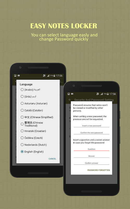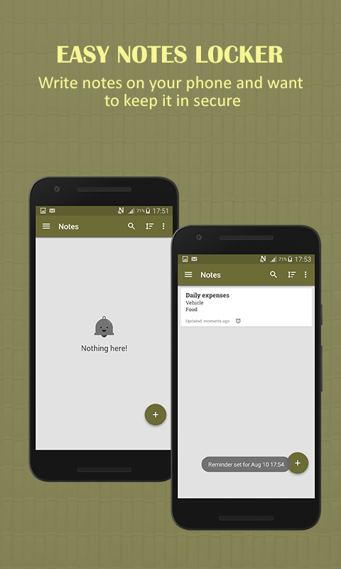 Nel Play Store un'applicazione lotto note, l'armadio sms, gavone app intelligente, schermata di blocco, e l'armadio WhatsApp è disponibile, ma la nostra noteslocker sicuro è diverso e unico. Non è una foto armadietto ma è possibile aggiungere 5 foto al appunti / appunto semplicemente possiamo dire appunti fotografici.