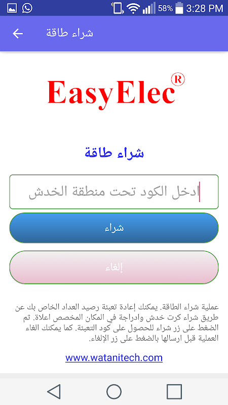 تطبيق EasyElec مقدم من الشركة الوطنية للصناعات الإلكترونية المحدودة - وطني تك. هذا التطبيق يمكن مشترك نظام الدفع المسبق للكهرباء من إعادة تعبئة (شحن)عداداتهم بواسطة كروت الخدش والتي يمكن الحصول عليها من قبل الشركة المزودة خدمة الكهرباء (القطاع التجاري) او نقاط البيع الخاصة بها. يعمل التطبيق على حفظ عمليات الشراء التي قام بها المشترك من اجل الرجوع اليها عند الحاجة.