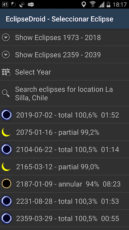 Nella schermata 'dettagli eclissi' ottieni informazioni complete sulle circostanze locali dell'eclissi. Premendo 'Menu' si aggiungerà l'eclissi al tuo calendario personale preferito.