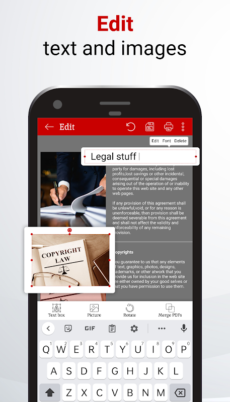 PDF Reader & Editor è un'applicazione gratuita che ti consente di leggere e modificare documenti PDF. È possibile combinare file, aggiungere segnalibri, estrarre immagini e dati di testo, convertire un'immagine o una foto in PDF.