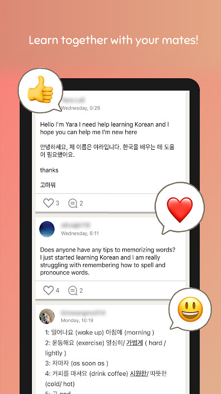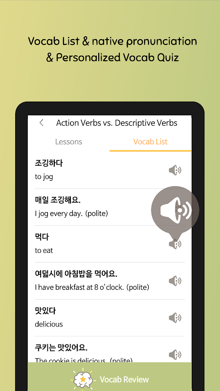 ✔ Parla come un madrelingua - Non è solo testo, ma anche audio per aiutarti con la pronuncia! I tutorial in lingua coreana di Eggbun includono l'audio di madrelingua coreani che sicuramente ti aiuteranno con il tuo vocabolario coreano e di lingua coreana.