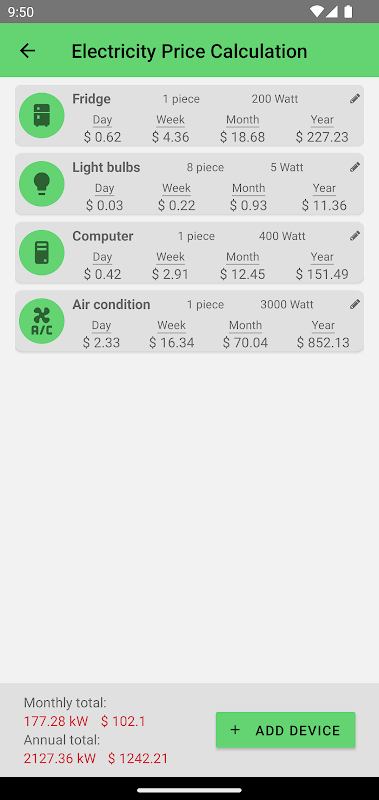 Calculate the electricity consumed by your electrical devices and their price.