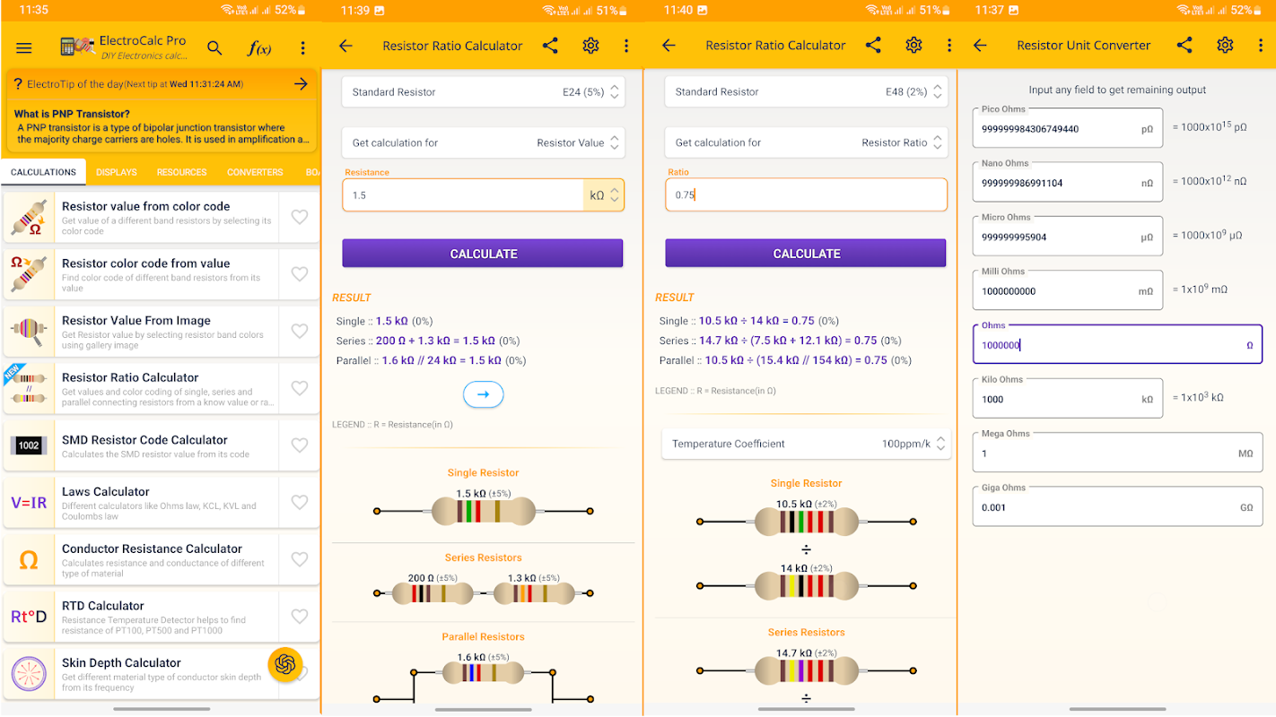 L'app ElectroCalc si concentra principalmente sui calcoli dei circuiti elettronici di potenza. Aiuta chi mostra interesse come hobbisti, fai da te verso i circuiti elettronici per calcolare i circuiti come indicato di seguito.