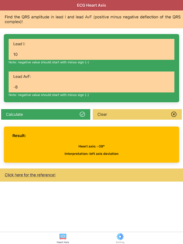 Disclaimer: all calculations must be re-checked and should not be used alone to guide patient care, nor should they substitute for clinical judgment. Calculations in this “Electrocardiogram (ECG) Rhythm App: Heart Axis” app might be different with your local practice. Consult to expert doctor whenever necessary.