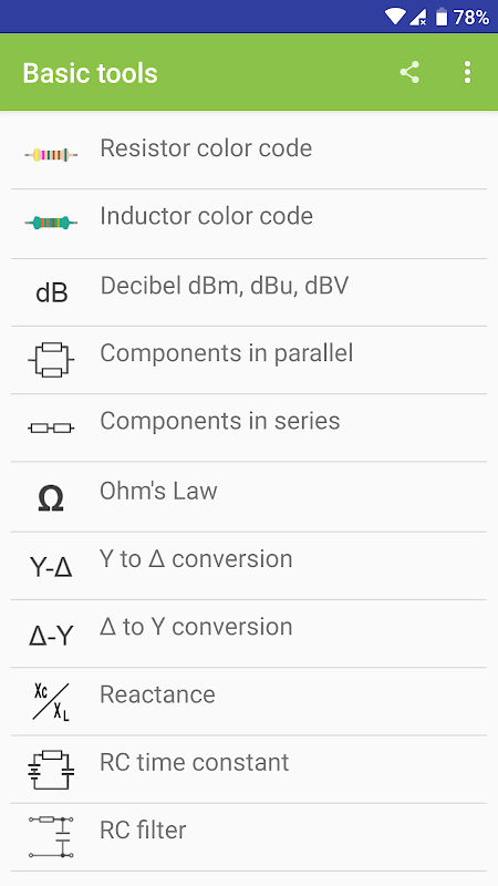 Questa app è una raccolta di calcolatrici elettroniche di base. È adatto per hobbisti, ingegneri elettronici o professionisti.