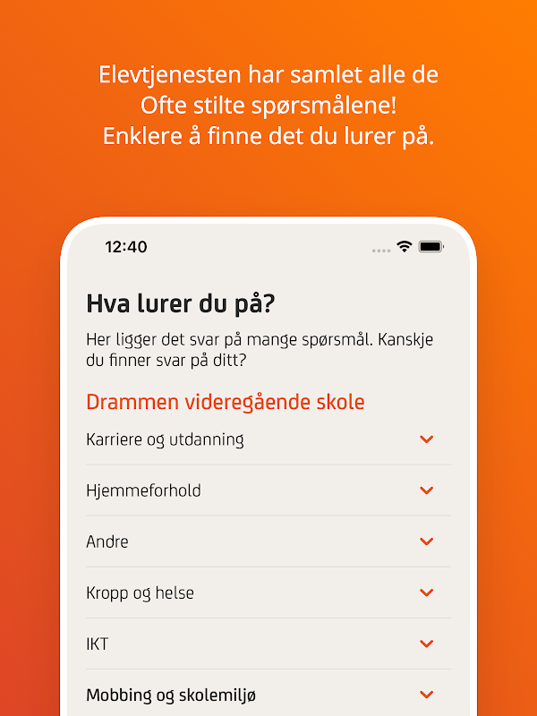 Nell'app puoi leggere le domande frequenti e ottenere risposte su corpo e salute, condizioni di casa, carriera e istruzione e altro ancora. Il servizio è gratuito per gli studenti. Le scuole secondarie superiori che utilizzano Kopling Elevtjenesten offrono anche un facile contatto con le risorse della scuola di appartenenza. Puoi scegliere di rimanere anonimo quando chatti con Kopling Elevtjenesten, ma ricorda che spesso sarà più facile per noi aiutarti se sappiamo chi sei.