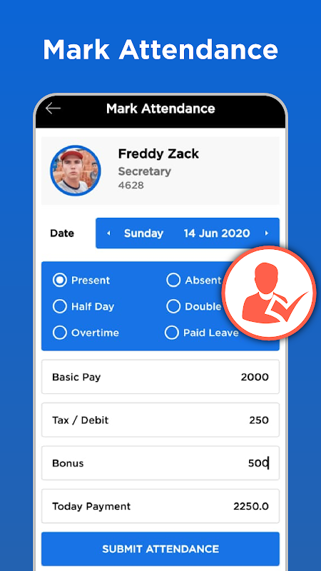Un modo semplice e veloce per gestire i dettagli del gestore di roba dei dipendenti come assistenza, foglie, prestito, tempo, app per il calcolo delle retribuzioni e molti altri. Non è necessario utilizzare il registro di frequenza o il registro di slittamento di gioco per la partecipazione dei lavoratori in quanto questa app di partecipazione può fare tutto il lavoro duro per te. Molto facile aggiungere o eliminare dipendenti e contrassegnare la presenza su base giornaliera. Ottieni un rapporto dettagliato di Presenze e Stipendio in formato PDF alla fine di ogni mese. Ora ricevi anche un riepilogo mensile di tutti i dipendenti con un semplice tocco. È un'app Employee completa.