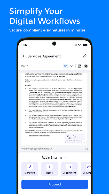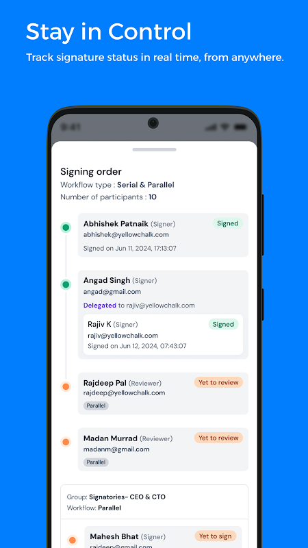 Si tratta di un concetto di ufficio senza carta sicuro al 100% che mira a sostituire gli sforzi manuali, i tempi e i costi relativi alla firma e al processo di approvazione basati su carta con una soluzione di firma di documenti online basata sul flusso di lavoro automatizzata, efficiente, che consente di risparmiare tempo e costi.