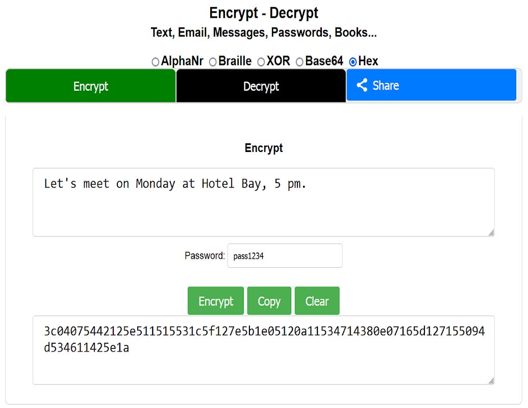 Crittografa e/o decrittografa: testi, e-mail, messaggi, password, libri, ecc. con o senza chiave password.
