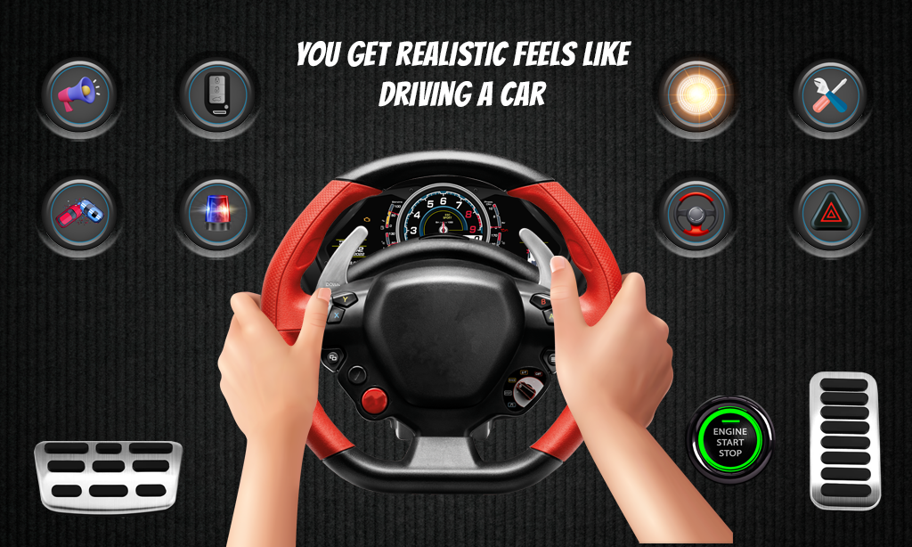 In Engine Sounds: Car Simulator, ottieni un'esperienza realistica del suono del clacson dell'auto, della sirena di emergenza, del movimento dello sterzo, dei fari, degli airbag, della chiave del telecomando dell'auto, dell'avvio / arresto del motore Suono di alta qualità con le sue animazioni. Ottieni sensazioni realistiche come guidare un'auto.