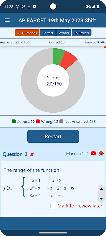 Modalità test completo: completa il test, visualizza il tuo punteggio finale con punteggi positivi e negativi e visualizza le tue prestazioni con un grafico a ciambella. Esamina le soluzioni per tutte le domande dopo l'invio.