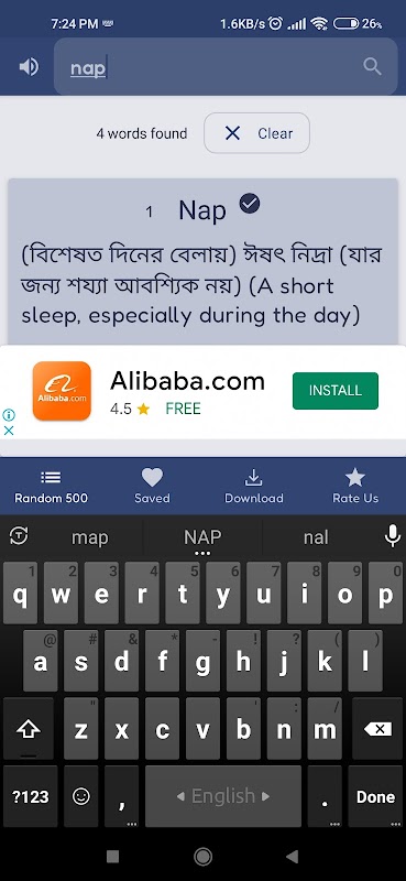 L'app ti consente di cercare parole inglesi nel repository e ascoltare le pronunce, comprese quelle non trovate nel dizionario remoto. Puoi anche cercare parole inglesi inserendo parole o frasi bengalesi, il che è un'ottima funzionalità per i madrelingua bengalesi.